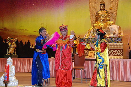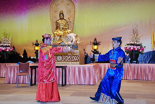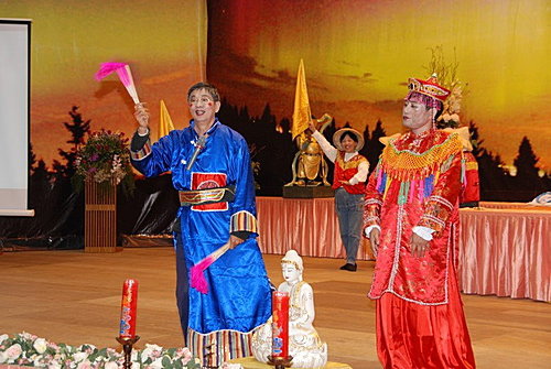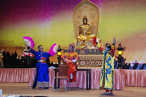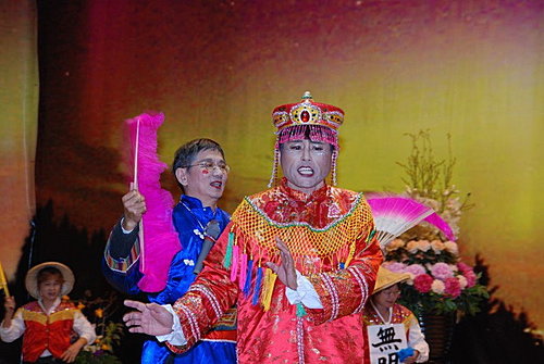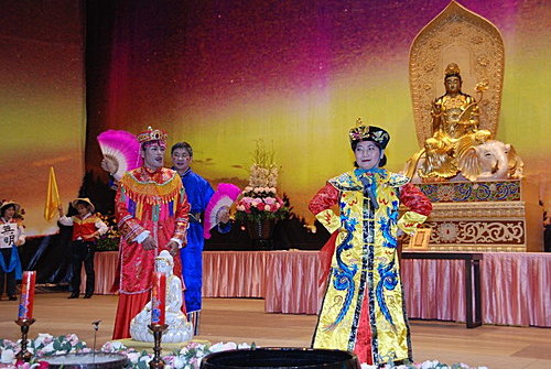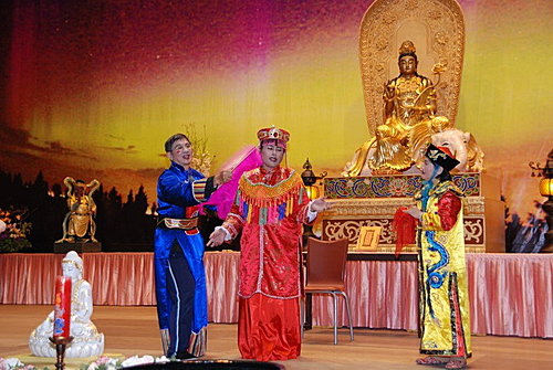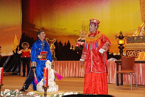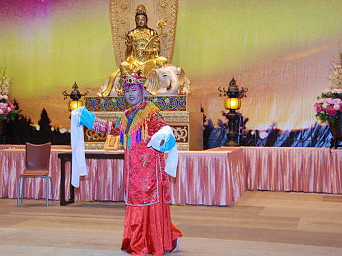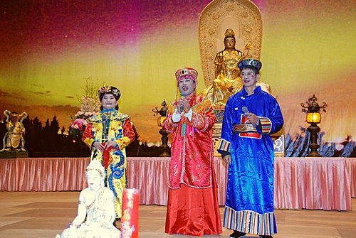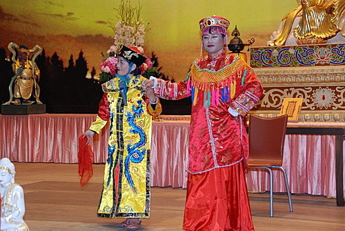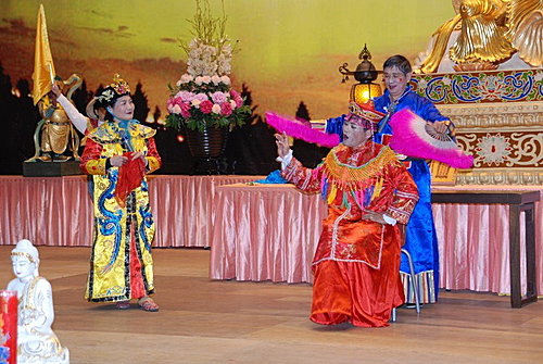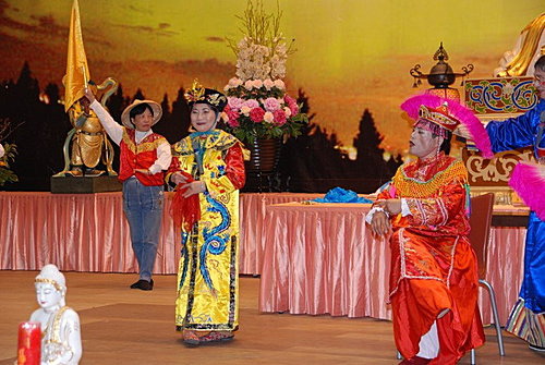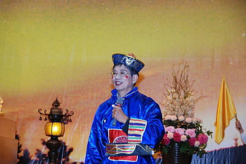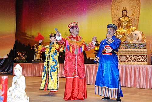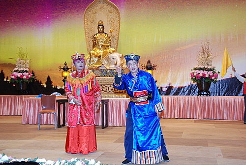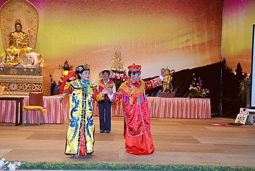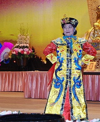 小:嘿!嘿!老佛爺!到時候,可就是我當家了,你可給我聽好,你想要用SK2化妝...甭想啦;你想到什麼、什麼...峰(等觀眾回應)塑身(畫美女曲線);你想要吃燕窩、人蔘長生不死,門都沒有。但你如果要訂人間福報,那就No problem!沒問題!
